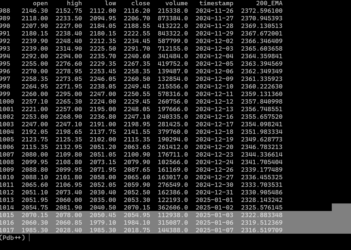 # Fetch historical data data = get_historical_data(symbol, start_date, end_date) # Ensure we have more than 250 candles if len(data) < 250: raise ValueError("Not enough data to calculate the 200 EMA. Provide more historical data.") # Calculate 200 EMA data = calculate_ema(data, period=200) # Print the latest data with EMA print(data.tail())