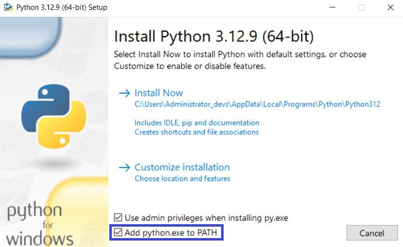 On the first screen, check the option “Add Python to PATH”.