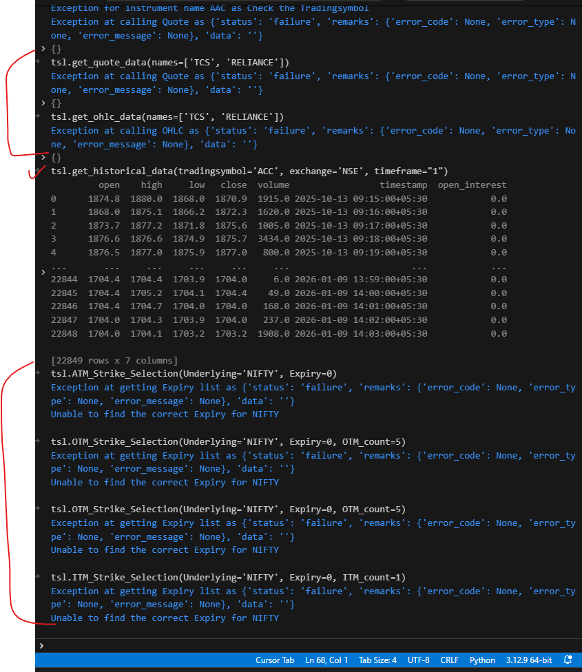 only Fetch Historical Data related python queries(get_historical_data, tsl.get_long_term_historical_data) are working and Fetch Live Market Data and Option Strike Selection related commands not working