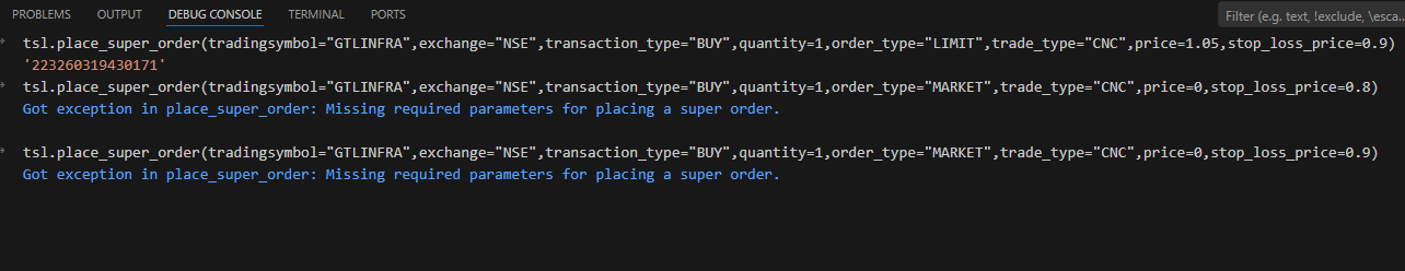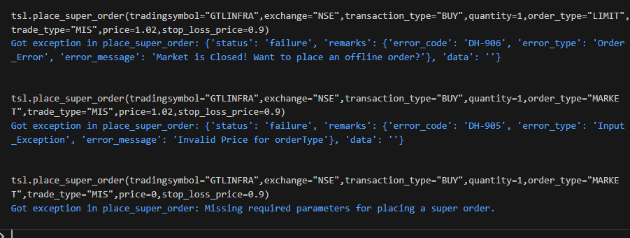 tsl.place_super_order(tradingsymbol=“GTLINFRA”,exchange=“NSE”,transaction_type=“BUY”,quantity=1,order_type=“MARKET”,trade_type=“MIS”,price=1.02,stop_loss_price=0.9)